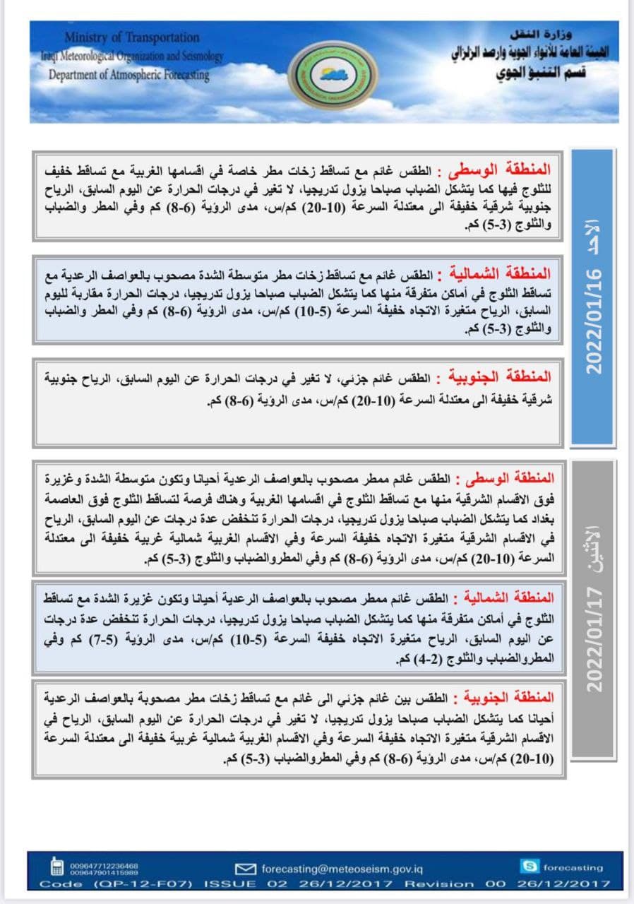 في ما يلي جدول لحالة الطقس، حصل “العراق أولاً” على نسخة منه،