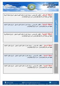 وأضاف البيان أيضا أن “حالة طقس يوم الأحد سيكون صحواً مع بعض الغيوم في المنطقتين الوسطى والجنوبية. بينما سيكون غائماً جزئياً في المنطقة الشمالية. أما درجات الحرارة فسترتفع قليلاً عن اليوم السابق في جميع انحاء البلاد”.
