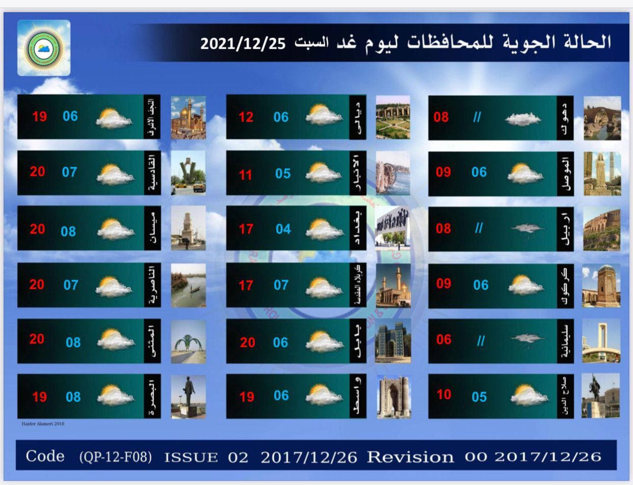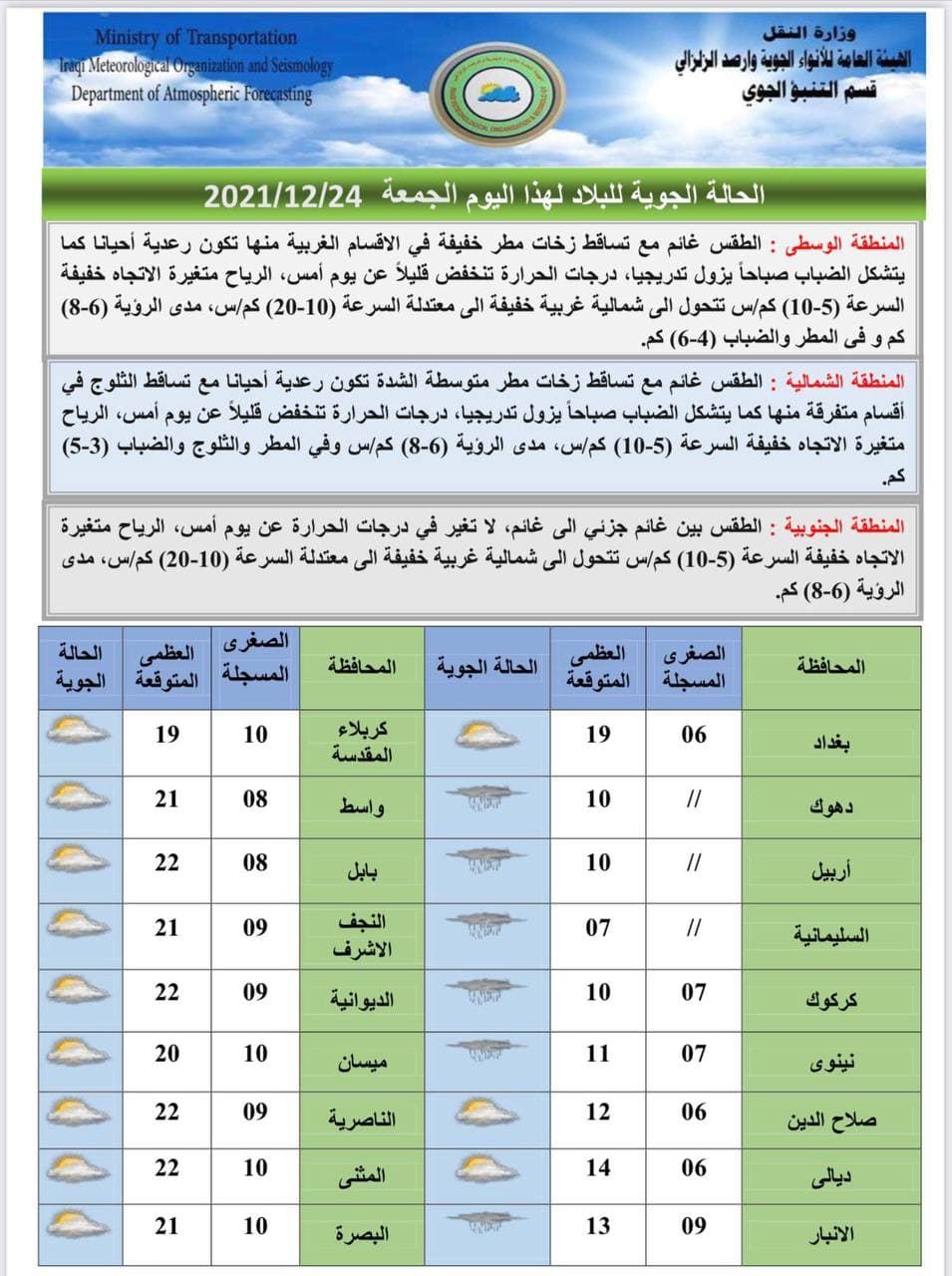 وذكر بيان للهيئة تلقى “العراق أولاً” نسخة منه أن “طقس البلاد ليوم غد السبت في المنطقتين الوسطى والجنوبية سيكون صحواً مع بعض القطع من الغيوم ،بينما سيكون طقس المنطقة الشمالية غائماً جزئياً الى غائم مع تساقط زخات مطر متفرقة وثلوج فوق المرتفعات الجبلية يتحسن تدريجياً ،وفي الأقسام الغربية الطقس صحو مع بعض القطع من الغيوم ،كما يتشكل الضباب صباحاً ،أما درجات الحرارة فستنخفض قليلاً في الأقسام الوسطى والجنوبية ،فيما ستكون مقاربة لليوم السابق في القسم الشمالي من البلاد”.