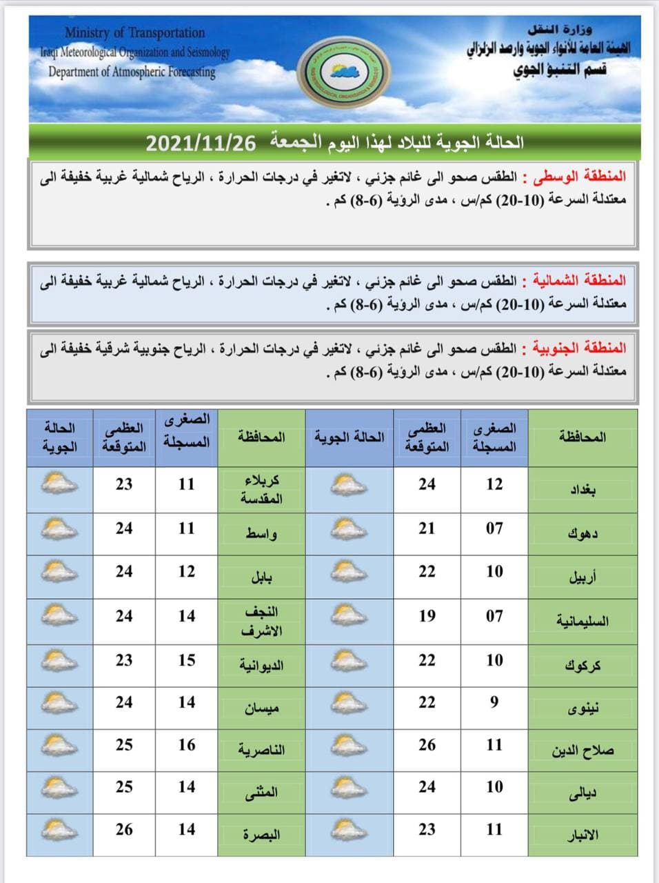 أعلنت هيئة الأنواء الجوية، اليوم الجمعة، عن حالة الطقس في العراق للأيام المقبلة، فيما توقعت انخفاض درجات الحرارة يوم غد السبت.