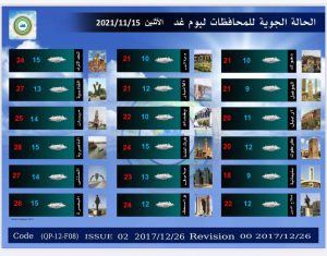 وأشار الى أن “الطقس يوم الأربعاء سيكون غائماً جزئياً في المنطقتين الوسطى والجنوبية ،وفي المنطقة الشمالية سيكون صحواً مع بعض الغيوم ، أما درجات الحرارة فسترتفع قليلاً عن اليوم السابق في جميع مناطق البلاد”.