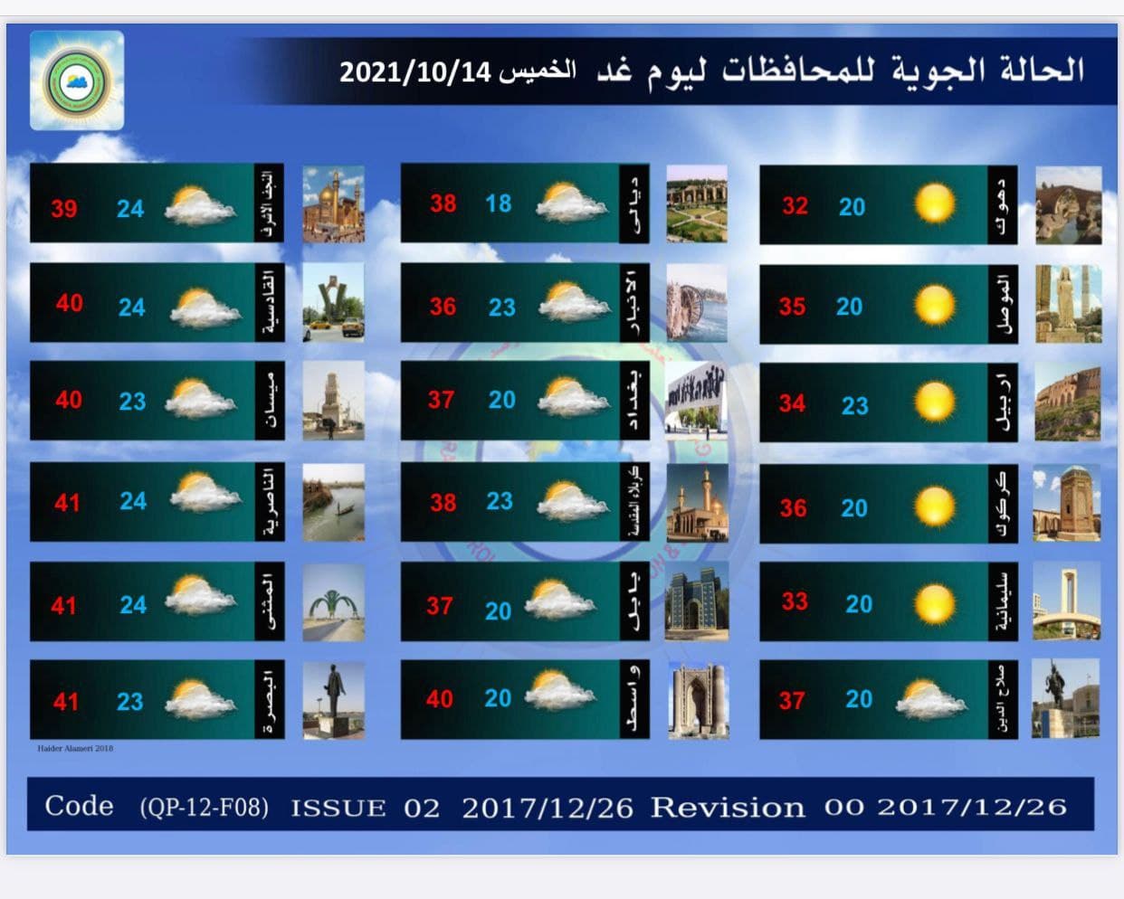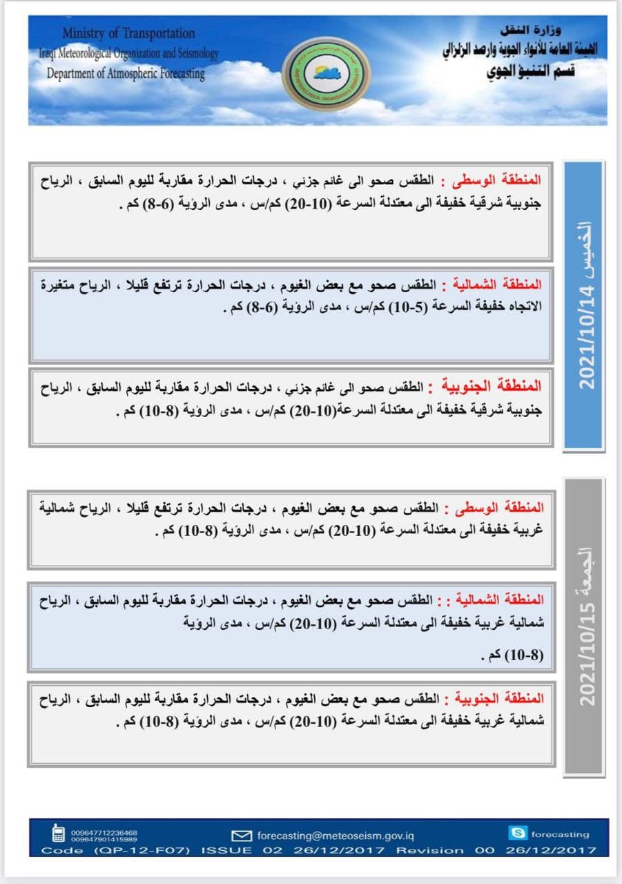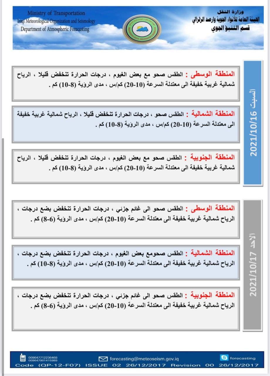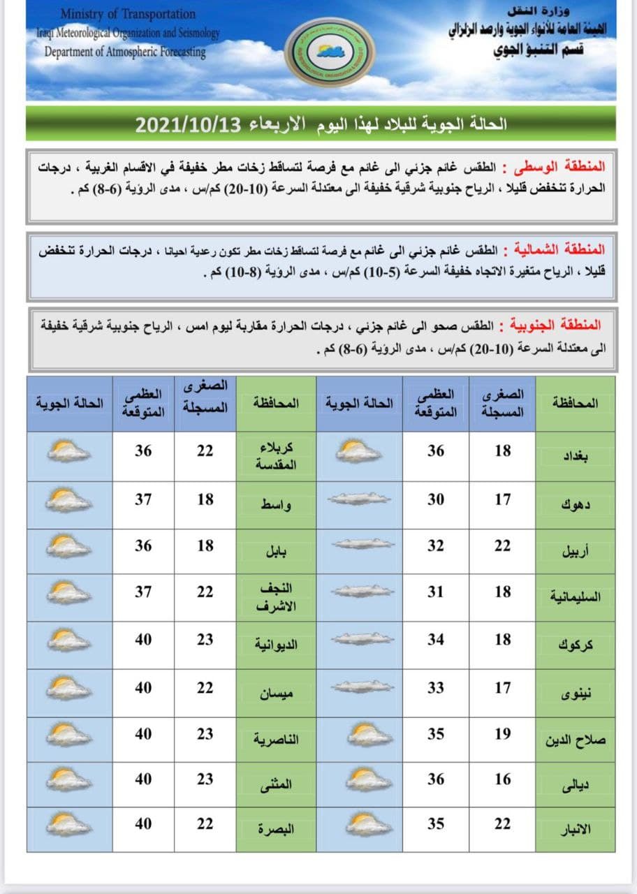 ولفت أيضا إلى أن “طقس يوم الأحد المقبل سيكون صحواً الى غائم جزئي والحرارة تنخفض بضع درجات في عموم البلاد. كما أن الرياح ستكون شمالية غربية خفيفة الى معتدلة السرعة (10- 20)كم/س في عموم البلاد”.