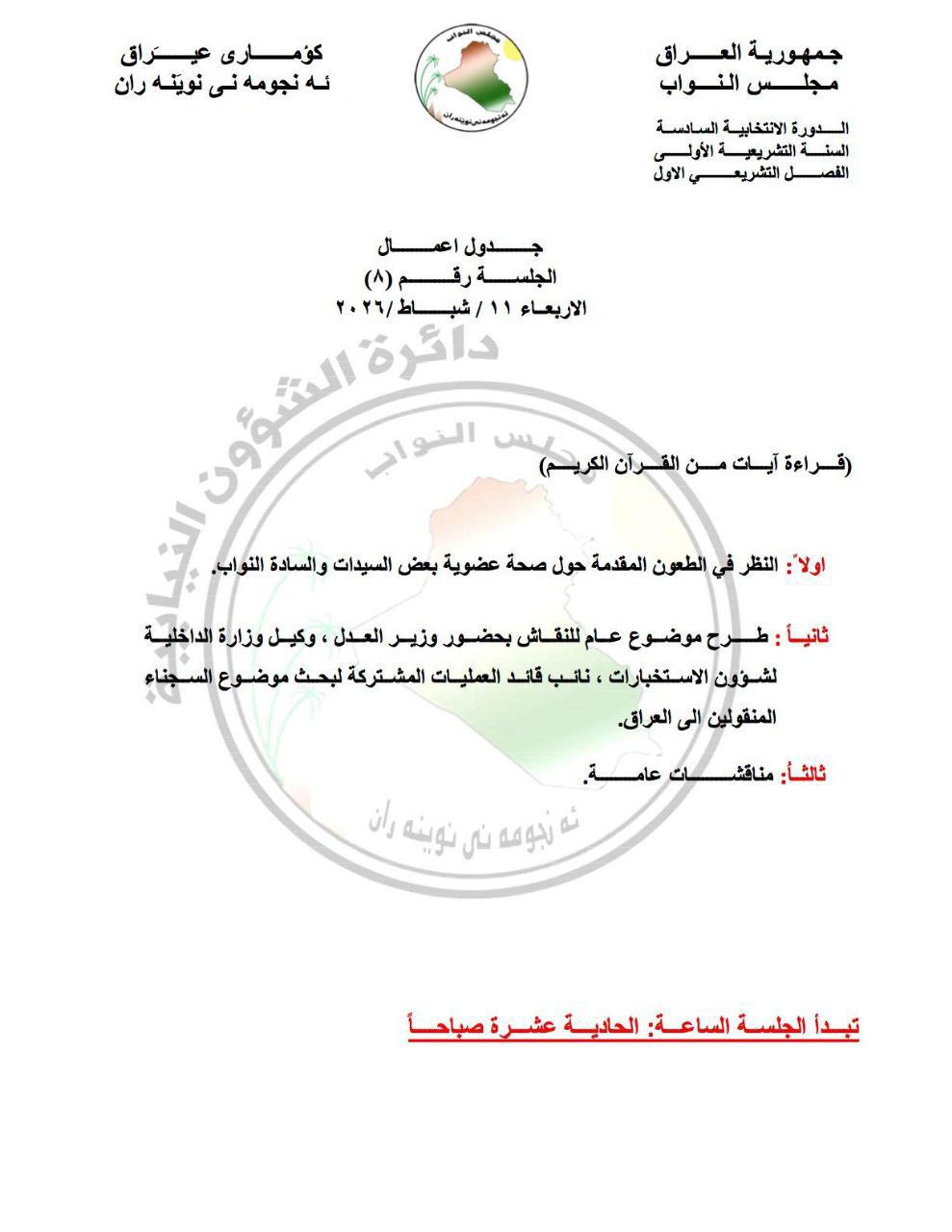 وأضافت، أن “الفقرة الثانية ستتضمن طرح موضوع عام للنقاش بحضور وزير العدل، وكيل وزارة الداخلية لشؤون الاستخبارات، ونائب قائد العمليات المشتركة، لبحث موضوع السجناء المنقولين إلى العراق“، مبيّنة أن “الفقرة الثالثة، ستكون مناقشات عامة”.
