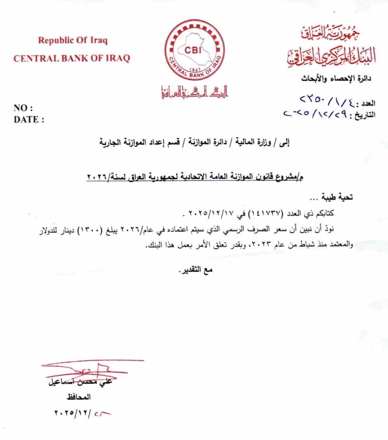 خاطب البنك المركزي العراقي، اليوم الخميس، وزارة المالية بشأن سعر الصرف الرسمي للدولار الذي سيُعتمد في مشروع قانون الموازنة العامة الاتحادية لعام 2026.