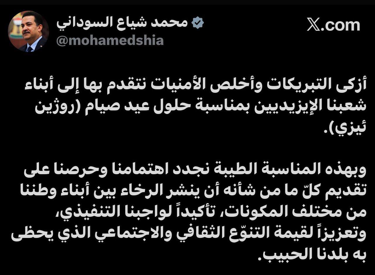 وقال السوداني، في تدوينة على منصة “إكس” تابعها “العراق أولاً”: “أزكى التبريكات وأخلص الأمنيات نتقدم بها إلى أبناء شعبنا الإيزيديين، بمناسبة حلول عيد صيام (روژين ئيزي)”.