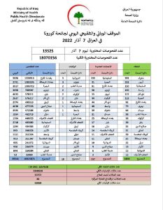 وأضاف البيان، أن “الوفيات الجديدة بكورونا بلغت 18 حالات في عموم محافظات البلاد”. لافتا إلى أن “الأشخاص الذين تلقوا اللقاح خلال 24 ساعة بلغ عددهم 45541”.