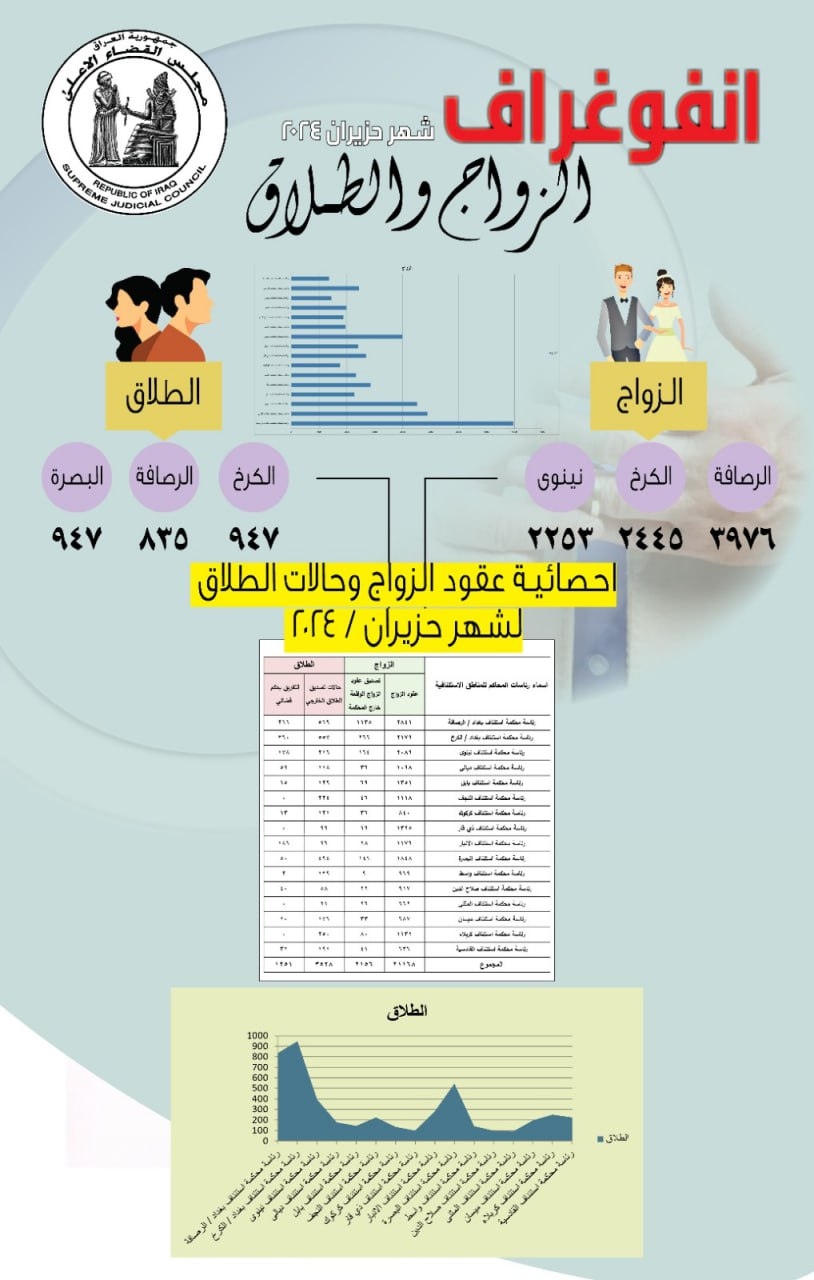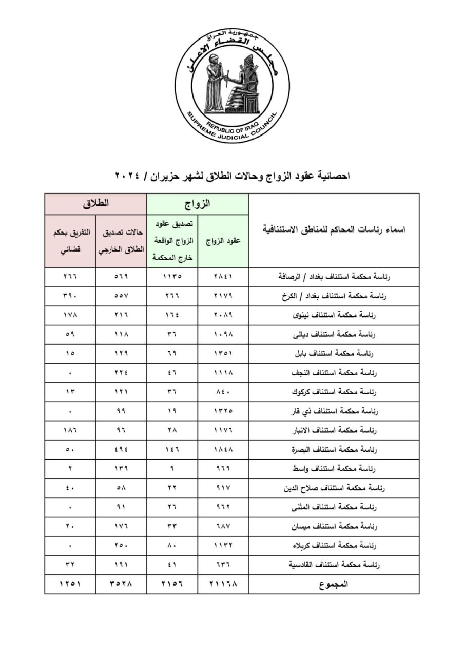 أصدر مجلس القضاء الأعلى، اليوم الأحد، إحصائية عقود الزواج وحالات الطلاق، خلال شهر حزيران الماضي.