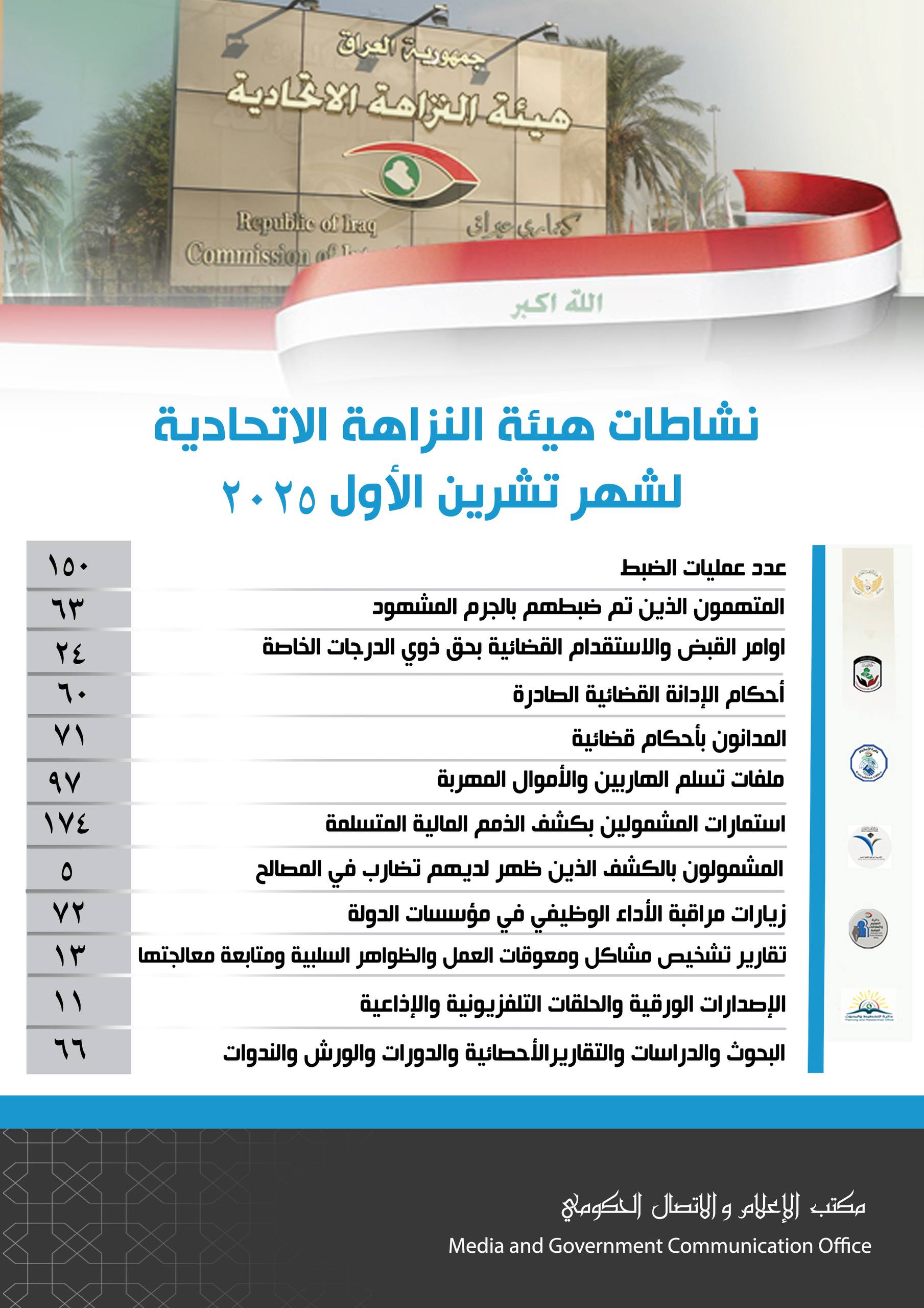 أعلنت هيئة النزاهة الاتحادية، اليوم الثلاثاء، عن مجمل نشاطاتها خلال شهر تشرين الأول الماضي.