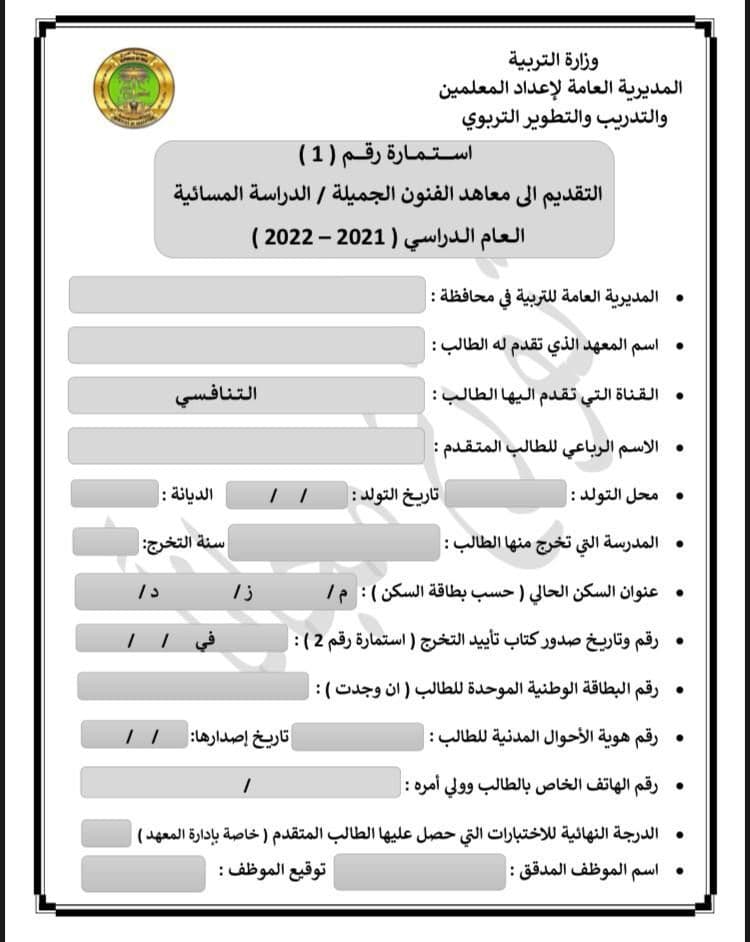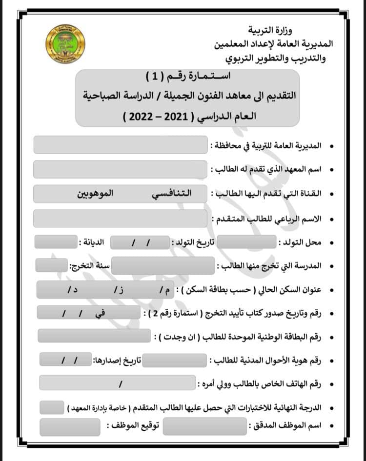 وبينت المديرية العامة لإعداد المعلمين والتدريب والتطوير التربوي. أن “السماح لجميع الطلبة التقديم على معاهد الفنون الجميلة الدراسة (المسائية) شرط ان يكون خريج الدراسة المتوسطة الاكاديمية او المهنية او ما يعادلها بموجب “معادلة الشهادة”. بغض النظر عن المعدل وسنة التخرج والعمر. كما يحق لجميع موظفي الدولة من خريجي الدراسة المتوسطة. التقديم أيضا لغرض اكمال دراستهم ضمن الاختصاصات الفنية الآتية: الفنون التشكيلية، التصميم، الخط العربي والزخرفة. الفنون السمعية والمرئية، الفنون المسرحية. الفنون الموسيقية والإرشاد). حيث تكون الدرجة النجاح الصغرى الخاصة باختبار تلك الاختصاصات هي (60)%”.