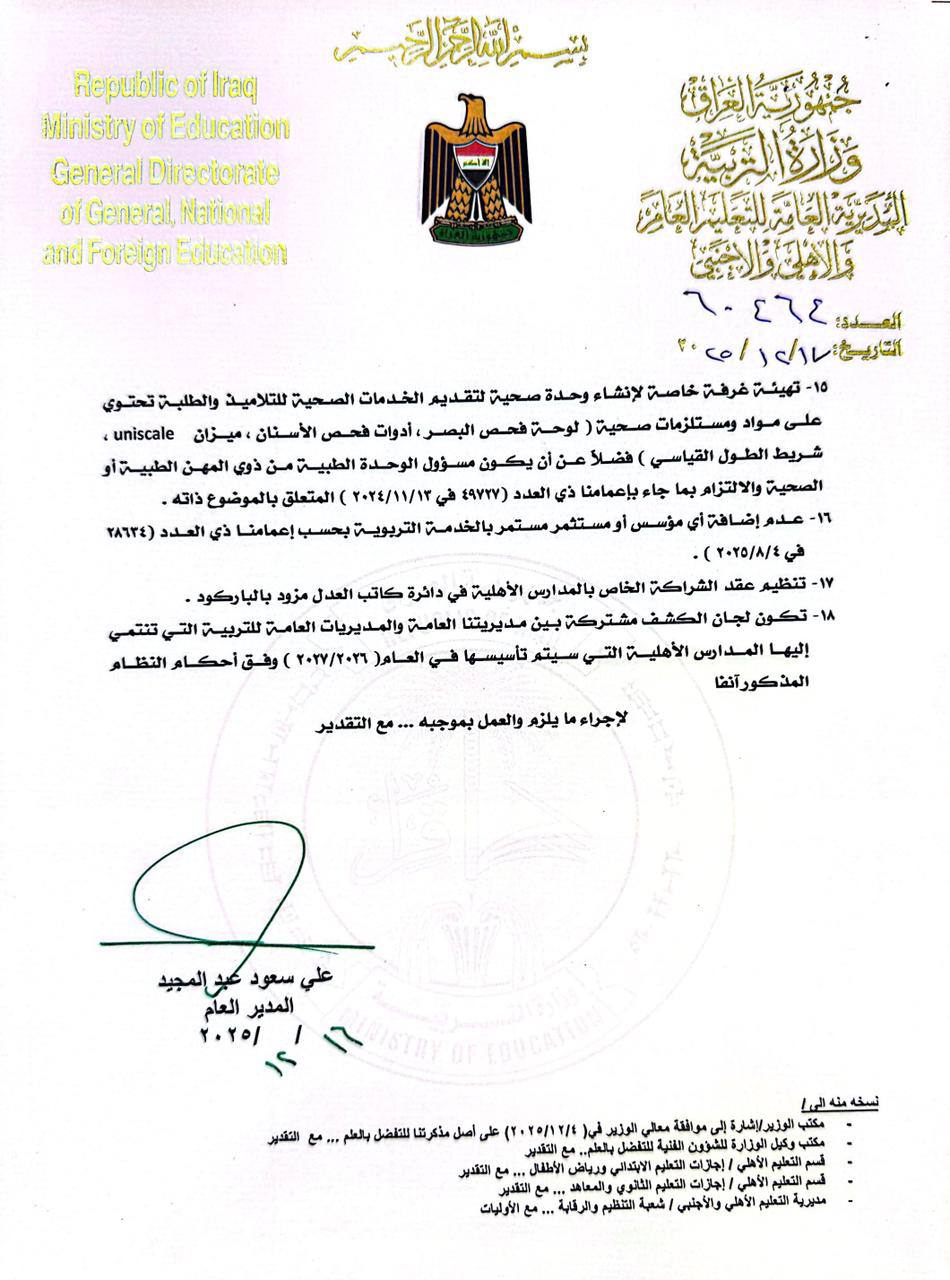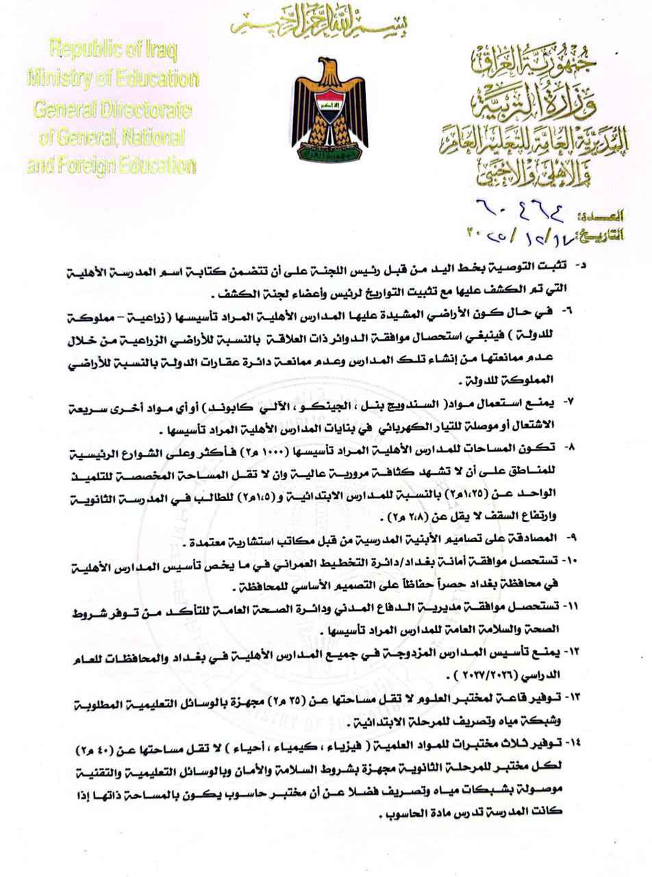 وذكرت الوزارة، في بيان تلقى “العراق أولاً” نسخة منه، أن “المديرية العامة للتعليم العام والأهلي والأجنبي، نشرت ضوابط وتعليمات تأسيس المدارس الأهلية، استعداداً للعام الدراسي المقبل، وكما موضح في الأدنى: