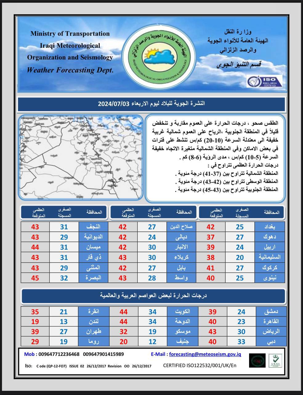 وذكر بيان للهيئة، تلقى “العراق أولاً” نسخة منه، أن “طقس يوم غد الخميس سيكون صحواً ودرجات الحرارة. ترتفع قليلاً وتنشط رياح في المنطقتين الوسطى والجنوبية، على فترات إلى (20 – 30) كم/س. ومدى الرؤية (6-8) كم”.