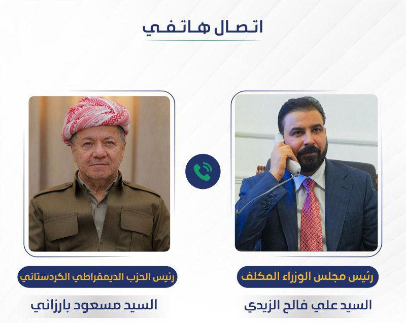 وقال المكتب الإعلامي لرئيس مجلس الوزراء في بيان تلقت “العراق اولا” نسخة منه، إن “رئيس مجلس الوزراء المكلف علي فالح الزيدي تلقى، اليوم الثلاثاء، اتصالا من رئيس الحزب الديمقراطي الكردستاني مسعود بارزاني، هنأه فيه بتكليفه مرشحاً من الكتلة الأكبر لتشكيل الحكومة الجديدة”.