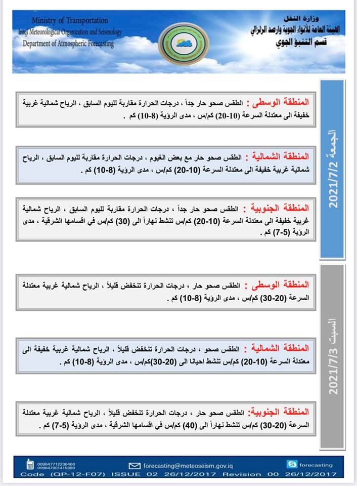 وقالت الهيئة، في بيان تلقى “العراق أولاً” نسخة منه، إن “طقس يوم غد الأربعاء والخميس المقبل سيكون في الوسط والجنوب صحواً حاراً جداً، وفي الشمال حاراً”.