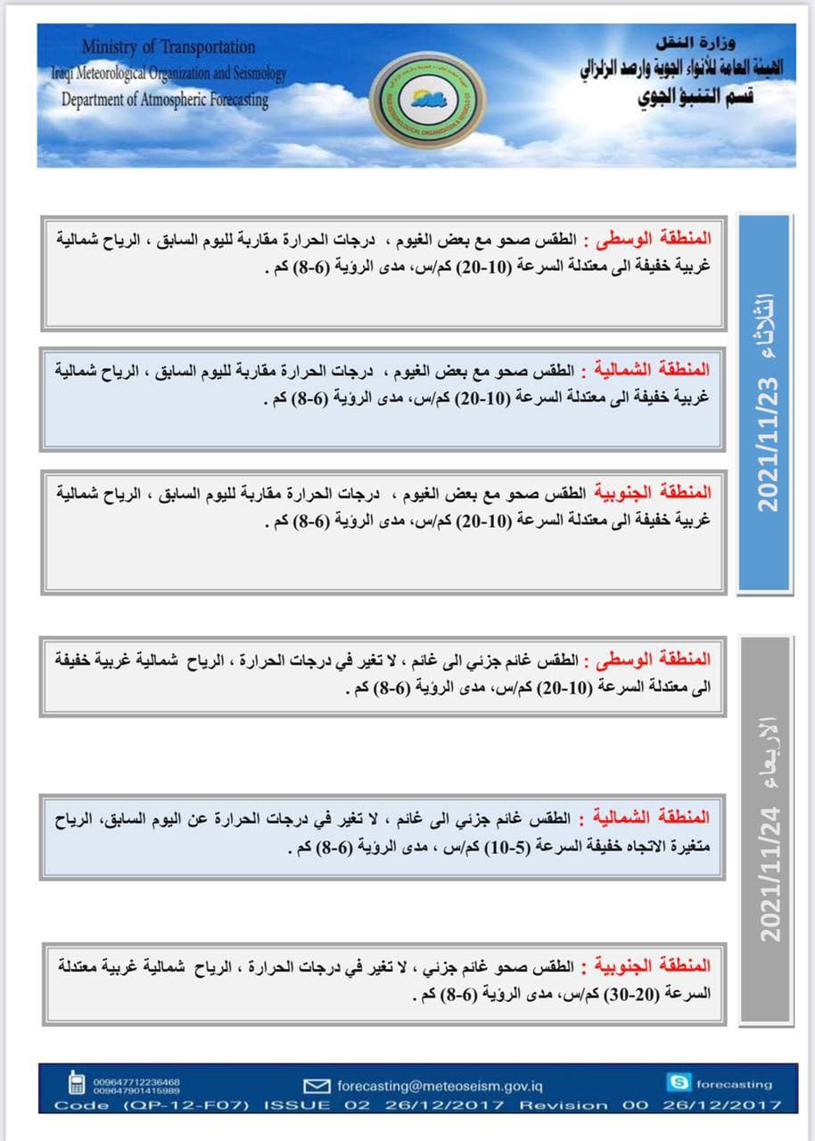 أعلنت هيئة الأنواء الجوية، اليوم الثلاثاء. عن حالة الطقس في البلاد للأيام المقبلة. فيما توقعت انخفاض في درجات الحرارة بدءاً من الجمعة.
