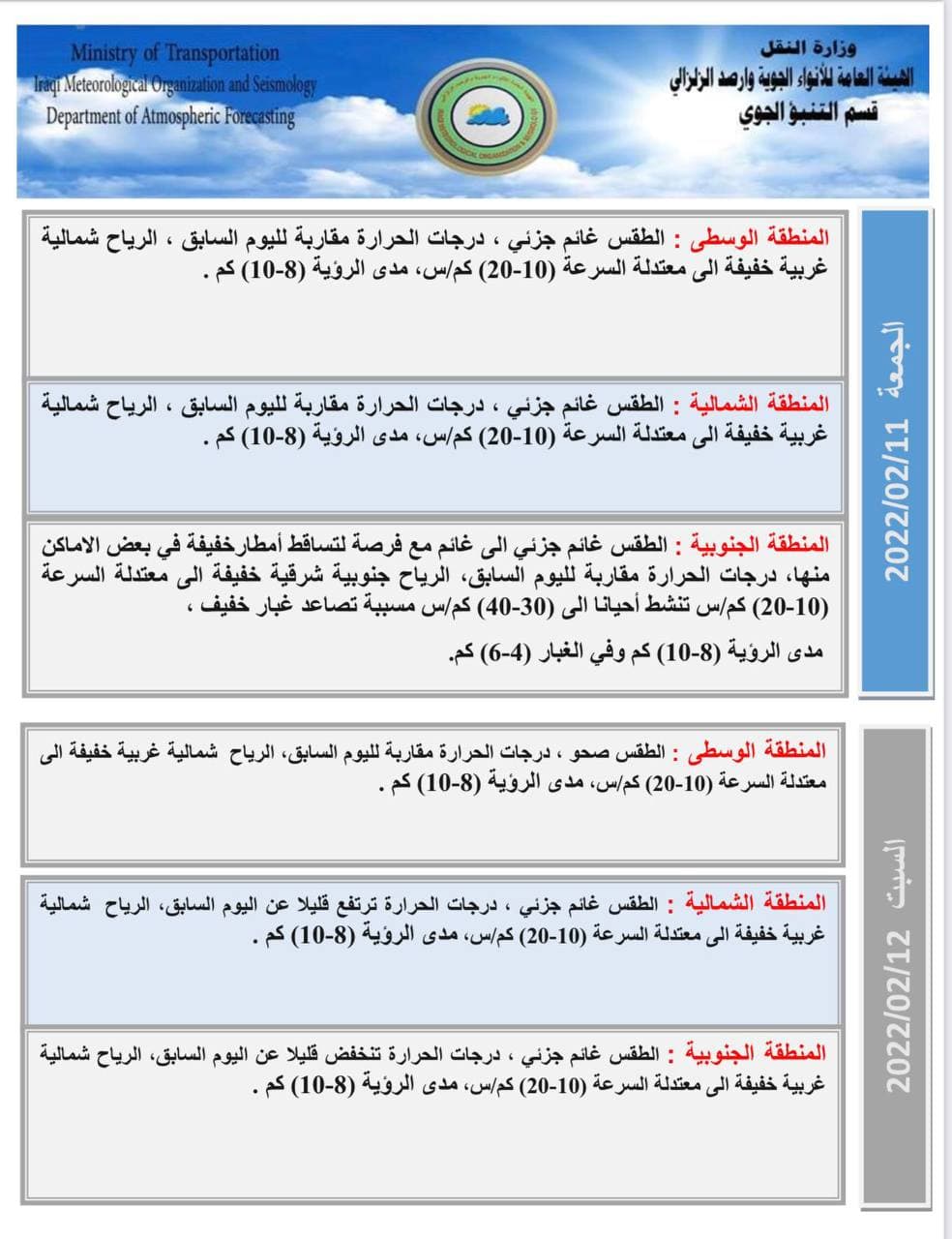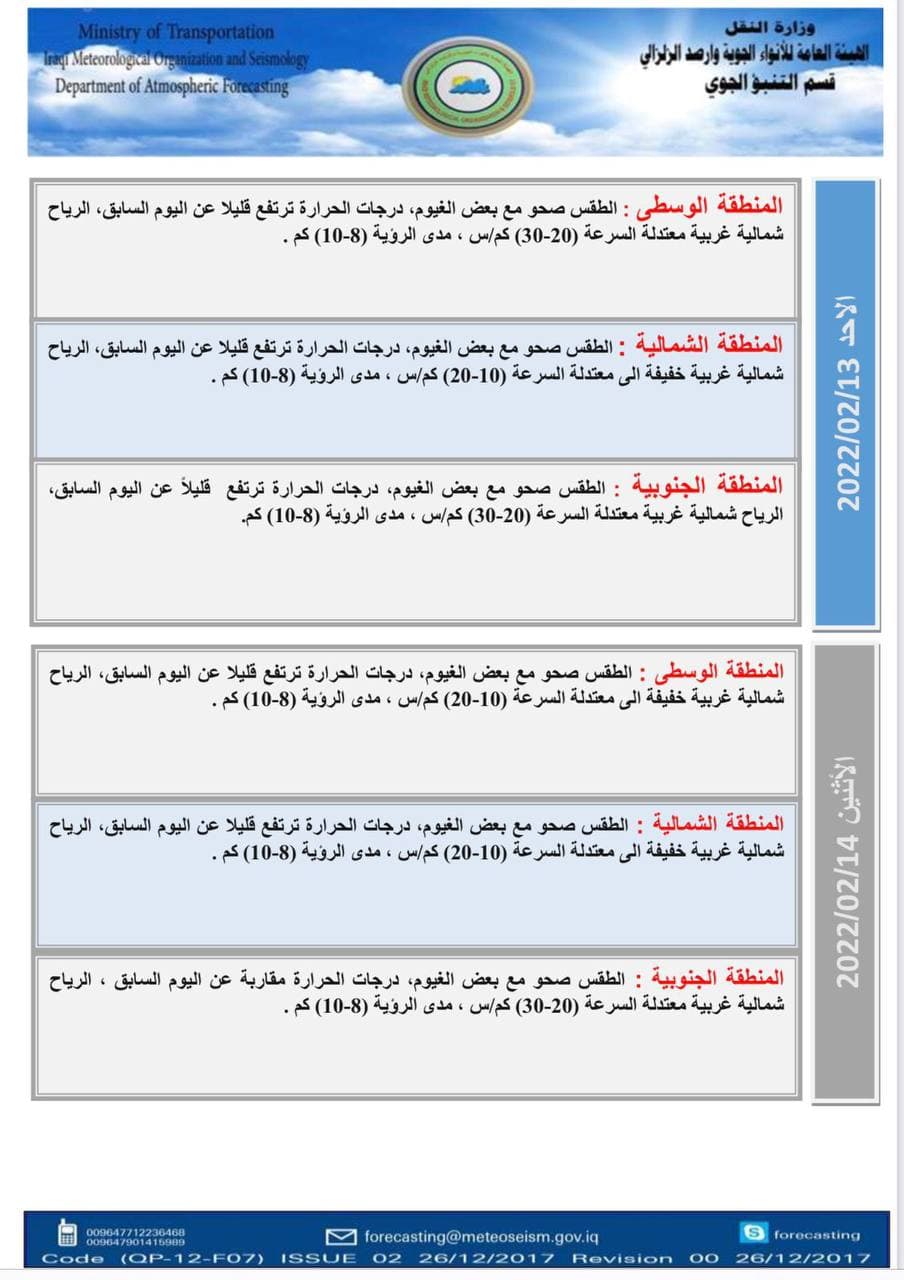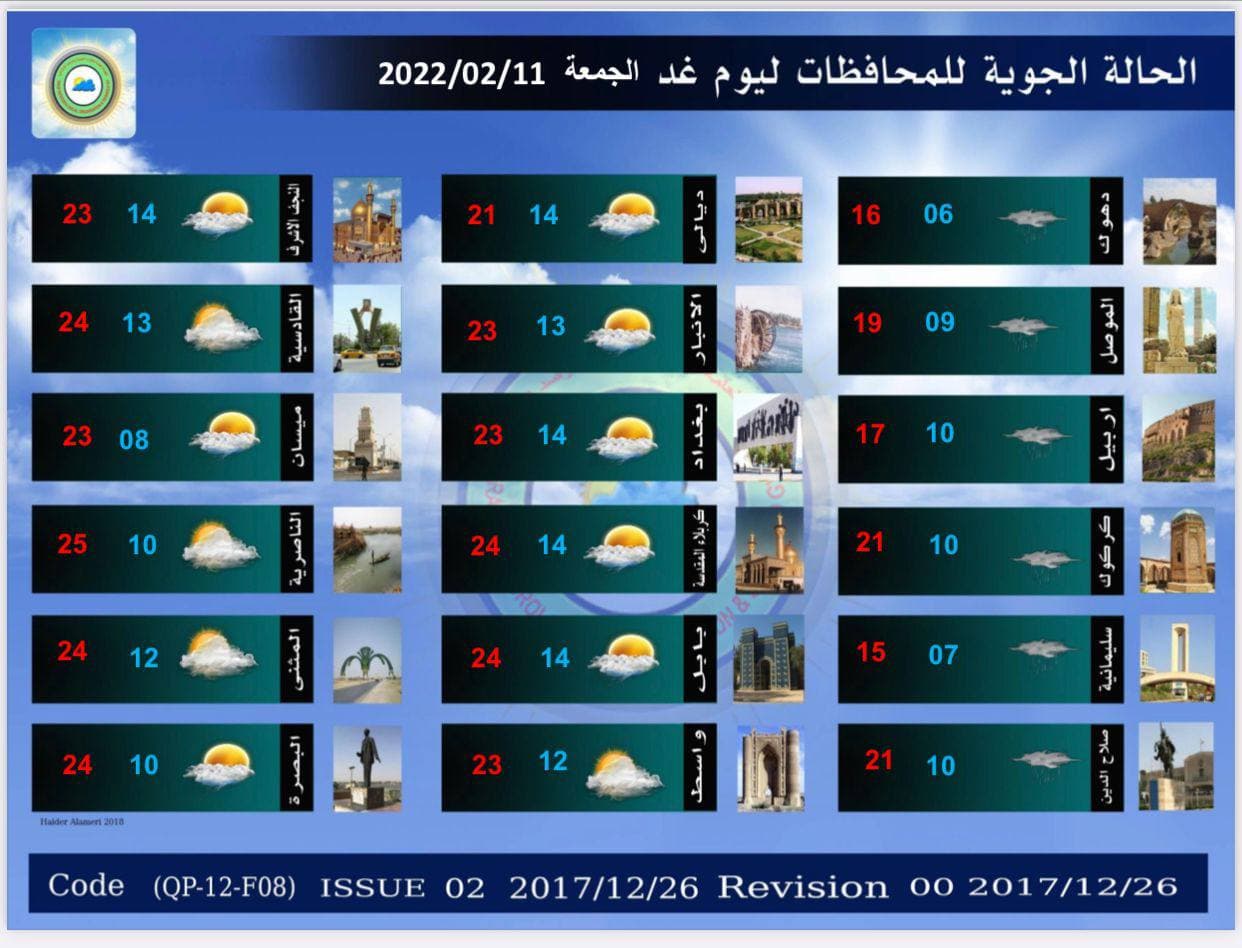 وذكر بيان للهيئة، تلقى “العراق أولاً” نسخة منه، أنَّ “طقس البلاد ليوم غد الجمعة. سيكون غائماً جزئياً في المنطقتين الوسطى والشمالية ، بينما سيكون الطقس في المنطقة الجنوبية غائماً جزئياً الى غائم مع فرصة لتساقط امطار خفيفة في بعض الاماكن منها. أما درجات الحرارة فستكون مقاربة لليوم السابق في عموم البلاد”.