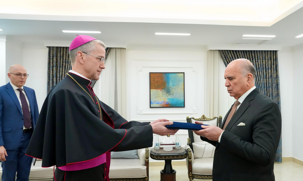 وقالت الوزارة، في بيان تلقى “العراق اولا” نسخة منه، إن “نائب رئيس مجلس الوزراء ووزير الخارجية، فؤاد حسين تسلم، اليوم الخميس، في مقر الوزارة ببغداد، أوراق اعتماد سفير دولة الفاتيكان غير المقيم لدى جمهورية العراق، السفير مونسنيور ميروسواف ستانيسواف واخوفيسكي”.