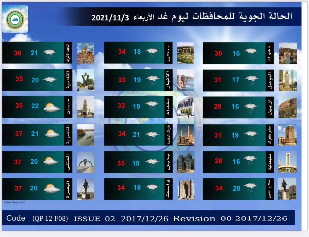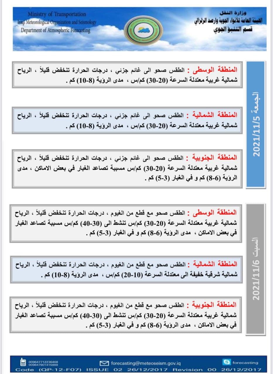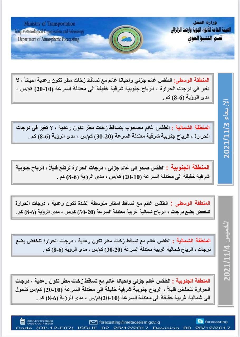 وذكرت الهيئة في بيان لها تلقى “العراق أولاً” نسخة منه. “الحالة الجوية لهذا اليوم الثلاثاء الموافق 2 تشرين الثاني 2021 مع كميات الترسبات المائية الساقطة على البلاد خلال ال 24 ساعة الماضية والأيام التي تليه والصادرة من قسم التنبؤ الجوي في الهيئة العامة للأنواء الجوية والرصد الزلزالي إحدى تشكيلات وزارة النقل”.
