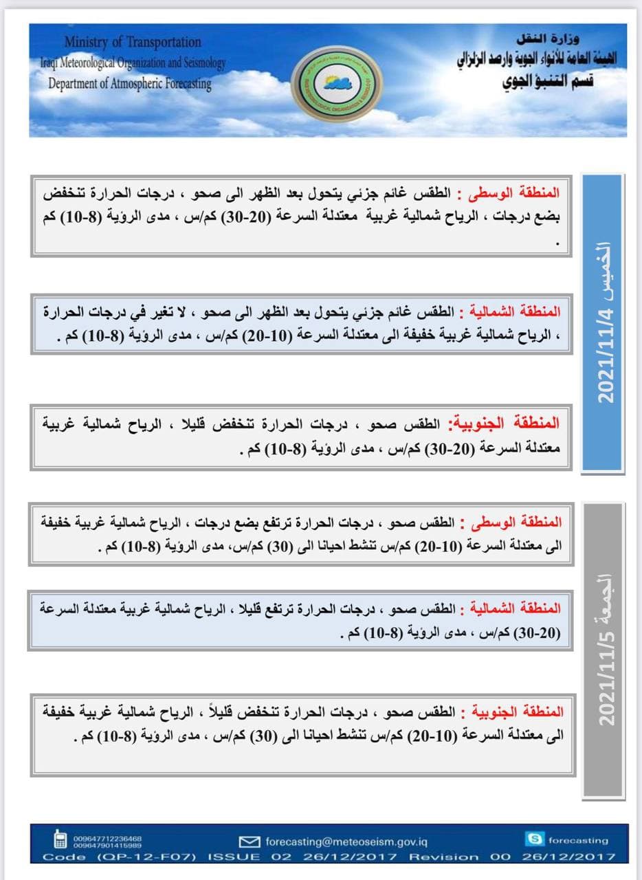 أعلنت الهيئة العامة للأنواء الجوية، اليوم الأربعاء، عن الحالة الجوية لهذا اليوم الأربعاء الموافق 3 تشرين الثاني 2021.